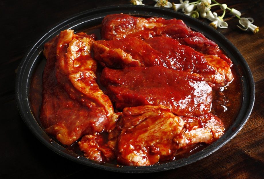 - Cho thịt vào tô lớn, thêm nước tương, dầu hào, mật ong, rượu mai quế lộ, ngũ vị hương, đường, hành tỏi băm, tiêu, muối, tương ớt và dầu điều.